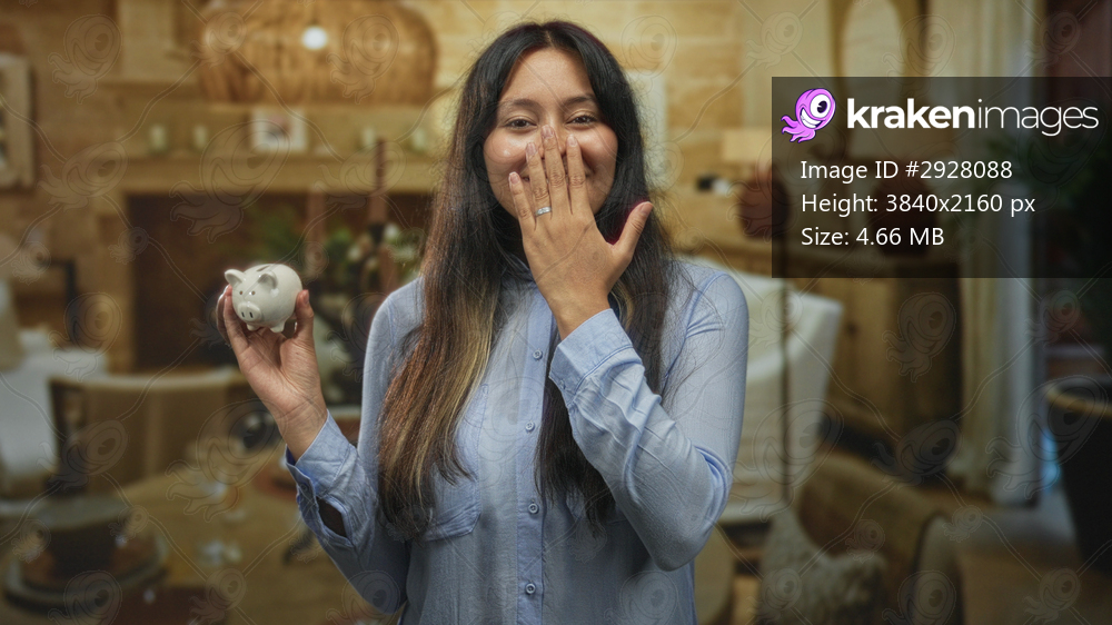 Hispanic woman holding a piggybank with hand covering mouth in a building living room; surprise savings.