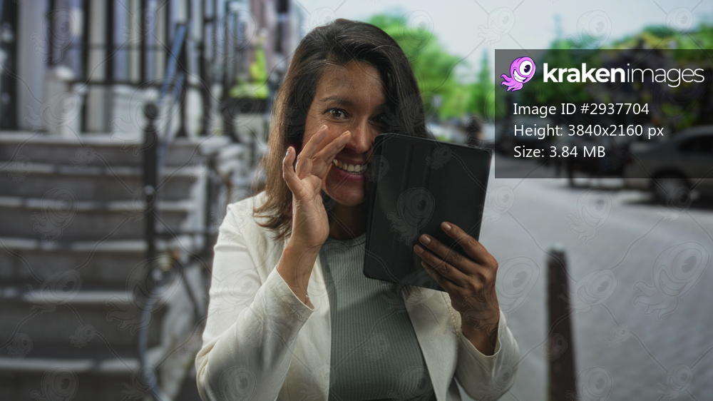 Hispanic woman holding a tablet and waving hand near her face on a city street with stone steps; cheerful connection.