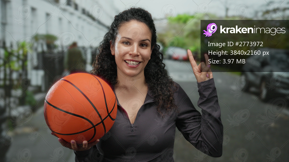 Hispanic woman holding basketball making rock gesture outdoors in urban street setting with a cheerful expression and casual sportswear.