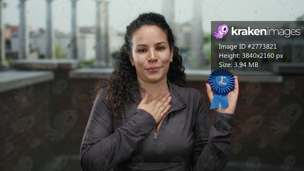 Hispanic woman holding blue ribbon standing near roman ruins with columns in background looking content outdoors during daytime.