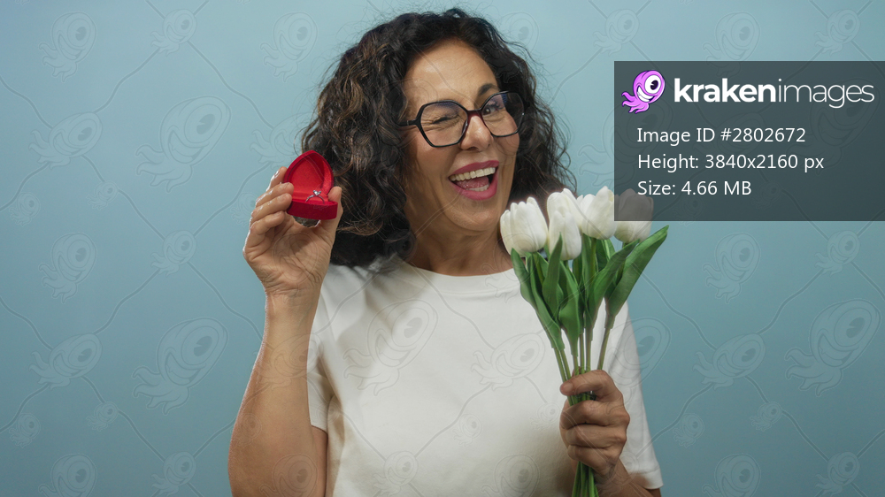 Hispanic woman holding bouquet and ring box against blue background, expressing joy for engagement proposal.