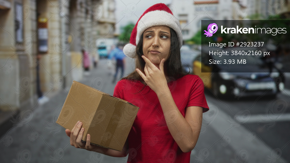 Hispanic woman holding cardboard box with hand on chin on street wearing santa hat and red shirt; quiet doubt.