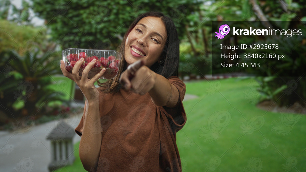 Hispanic woman holding clear plastic container of raspberries points finger at camera in park; playful invitation.