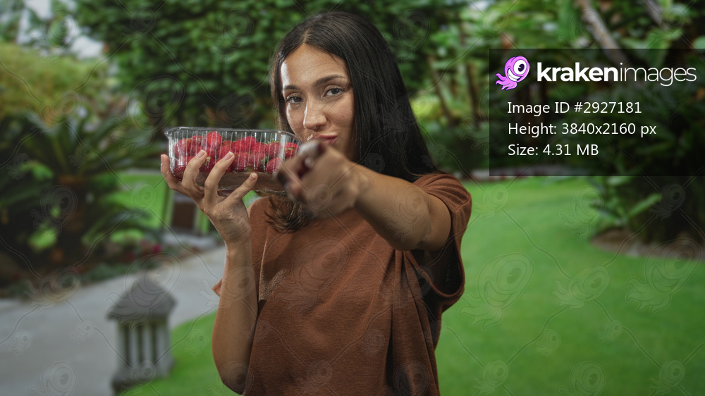 Hispanic woman holding clear plastic container of raspberries points finger at camera in park; playful invitation.