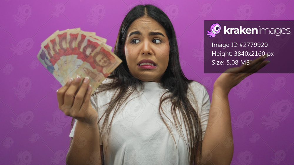 Hispanic woman holding colombian pesos with a puzzled expression against a vibrant pink background, conveying financial uncertainty and emotion.