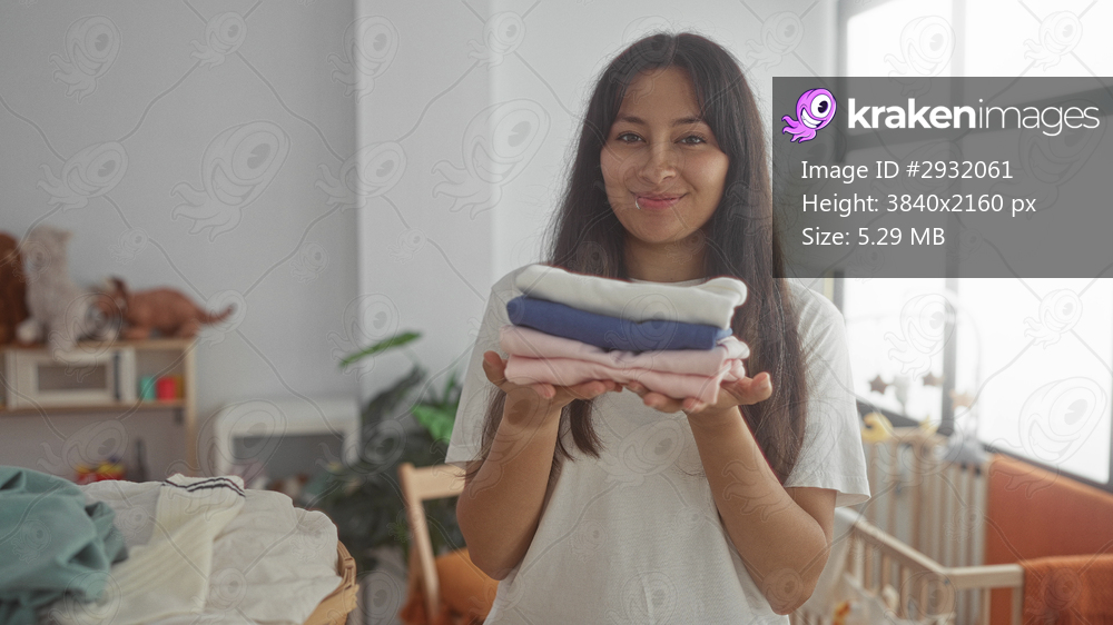 Hispanic woman holding folded baby clothes with hands in laundry room; motherhood care nurturing tenderness.