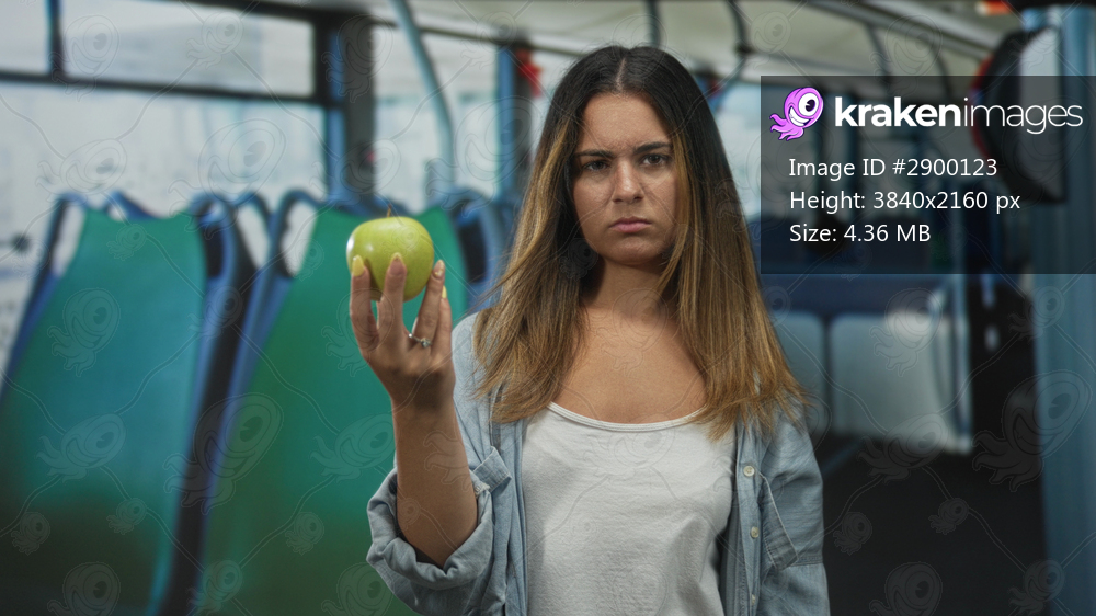 Hispanic woman holding green apple and frowning on bus in building; annoyance travel discomfort commute.