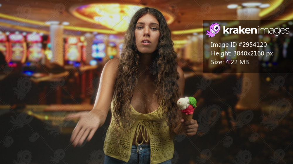 Hispanic woman holding ice cream cone, hand raised in a waving gesture inside a casino building; pleading.