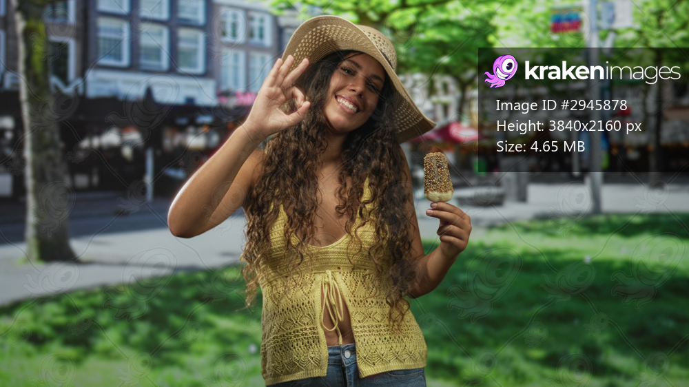 Hispanic woman holding icecream and making ok sign on street near cafe and park, wearing sunhat and yellow top; carefree summer joy.