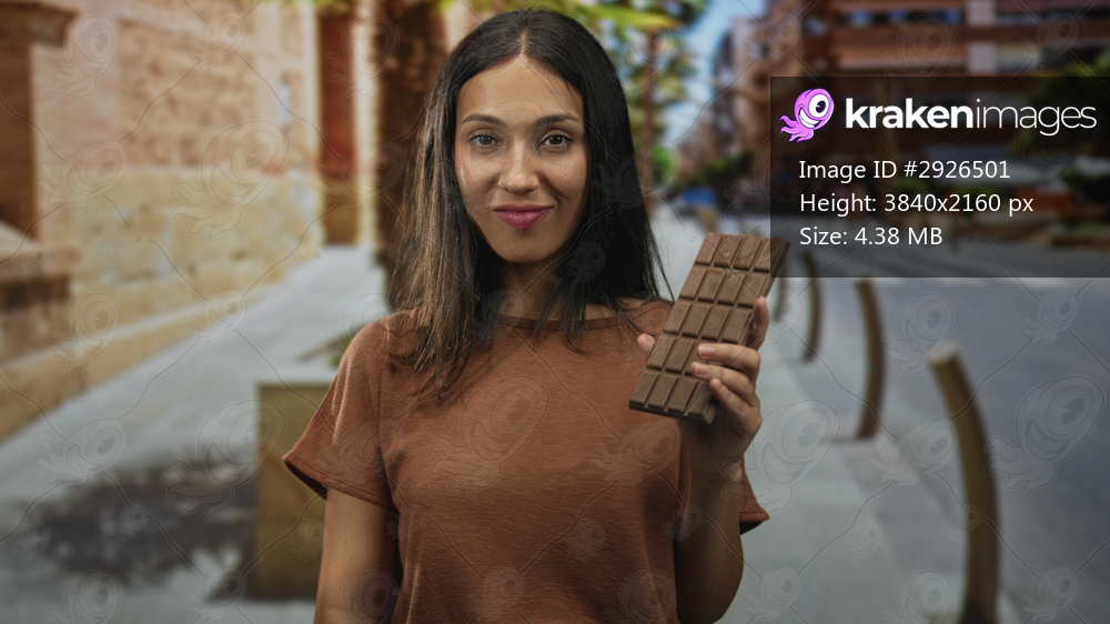 Hispanic woman holding large milk chocolate bar on sunlit city street, smiling subtly; sweet indulgence pleasure.