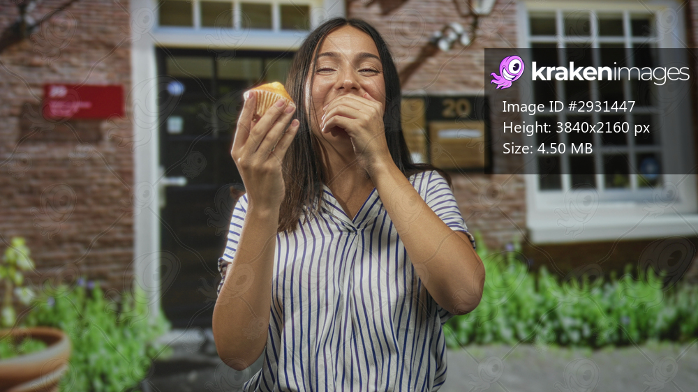 Hispanic woman holding muffin with hand to mouth laughing at building entrance by window and potted plant; happiness.