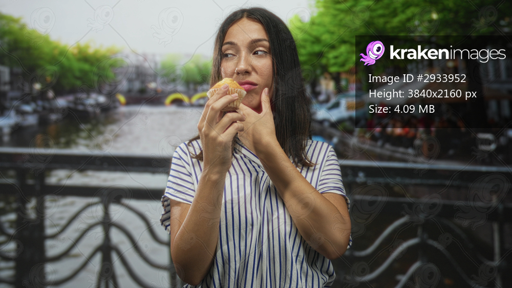 Hispanic woman holding muffin and touching chin with closed eyes beside canal bridge and outdoor cafe on a street in amsterdam; craving contemplation.