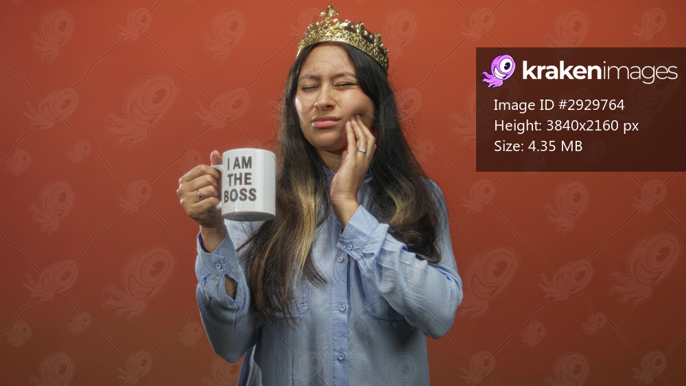 Hispanic woman holding mug reading i am the boss while pressing cheek with hand in orange studio; discomfort.