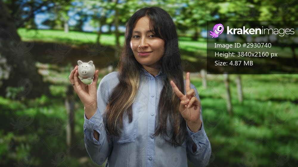 Hispanic woman holding piggybank and showing peace sign in a forest while smiling and presenting savings; saving money optimism.