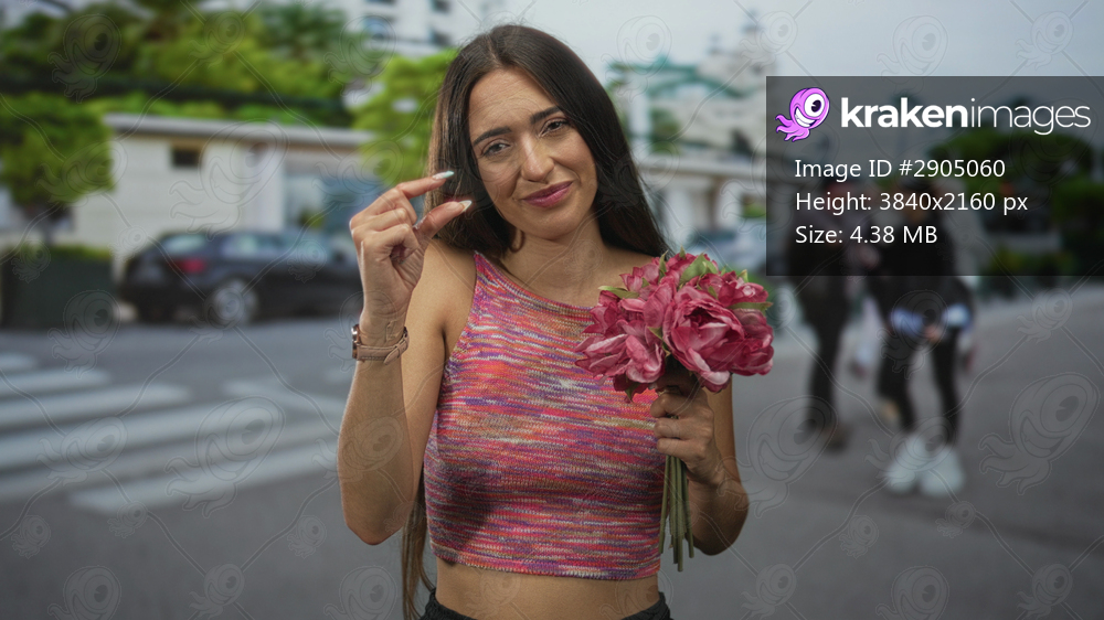 Hispanic woman holding pink bouquet and pinching fingers to show small size on city street near crosswalk and parked car; playful affection.
