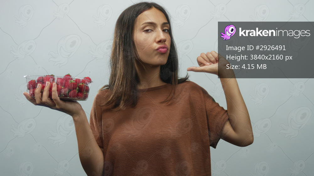Hispanic woman holding plastic container of strawberries with thumb pointing to herself in a pale blue studio; playful confidence.