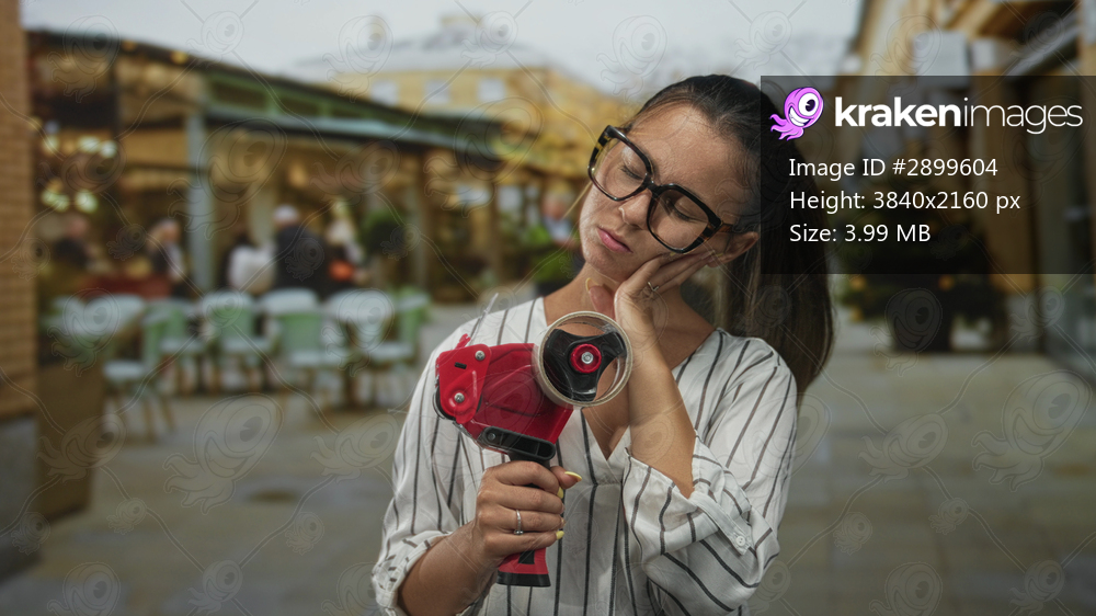 Hispanic woman holding red tape dispenser and touching cheek on a city street; toothache discomfort.