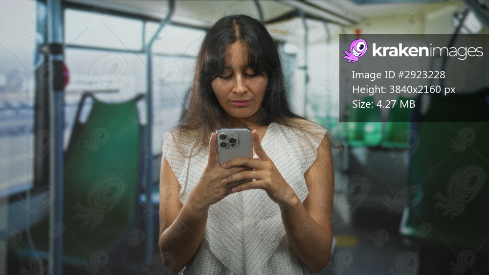 Hispanic woman holding smartphone with fingers typing on a city bus, hands and phone framed against green seats and windows street view; daily commute concentration. - Kraken Images