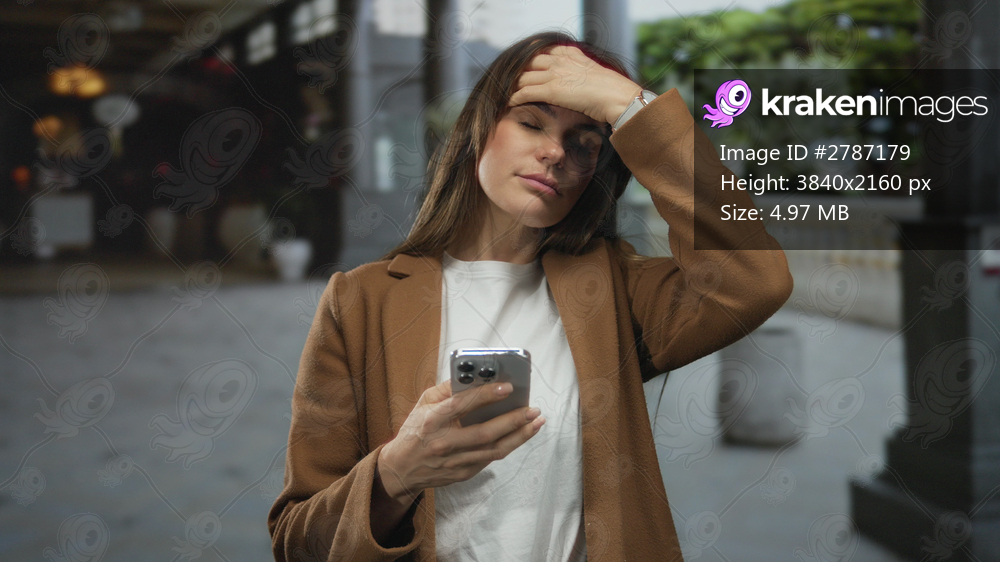 Hispanic woman holding smartphone looks distressed while standing outdoors in busy city street, showing signs of a headache under the daylight.