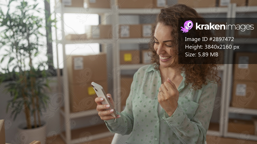 Hispanic woman holding smartphone and parcel in a storage building, smiling and checking orders on screen; small business joy.