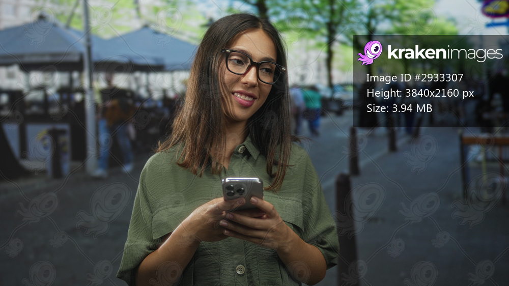 Hispanic woman holding smartphone and typing with both hands on a busy street cafe terrace; casual contentment connection.