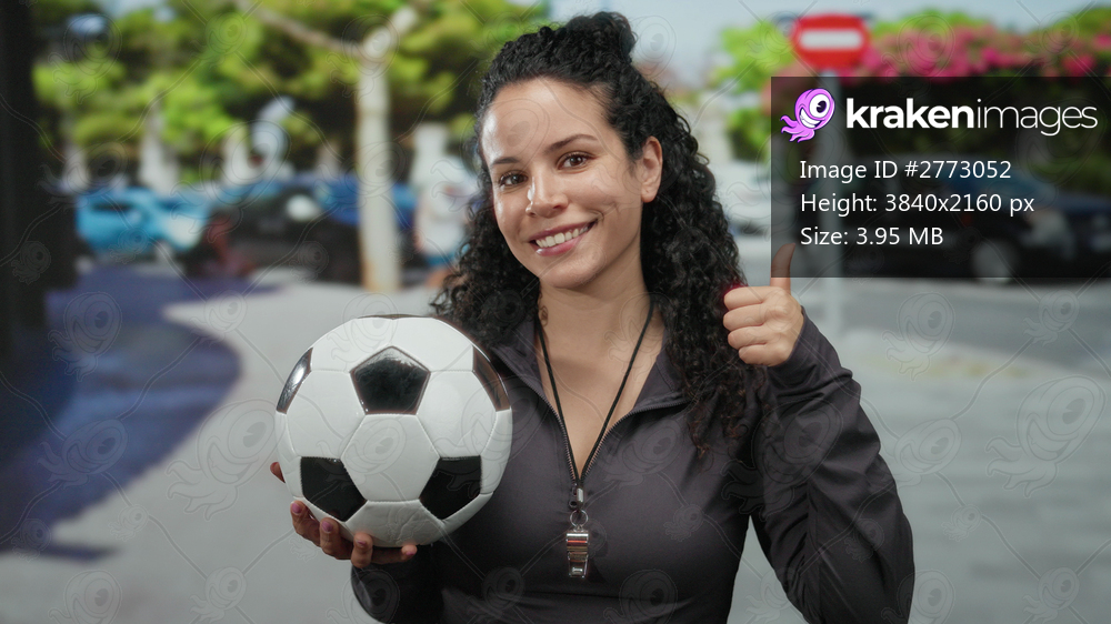 Hispanic woman holding soccer ball gives thumbs up on busy street, capturing athletic enthusiasm and urban energy outdoors.