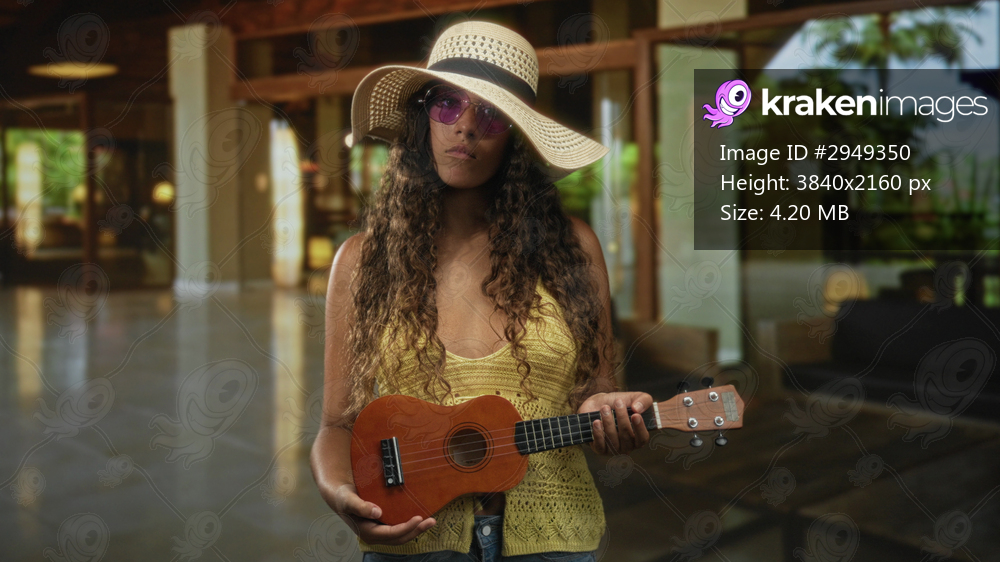 Hispanic woman holding ukulele, wearing straw sun hat and sunglasses inside a hotel building lobby; vacation relaxed.