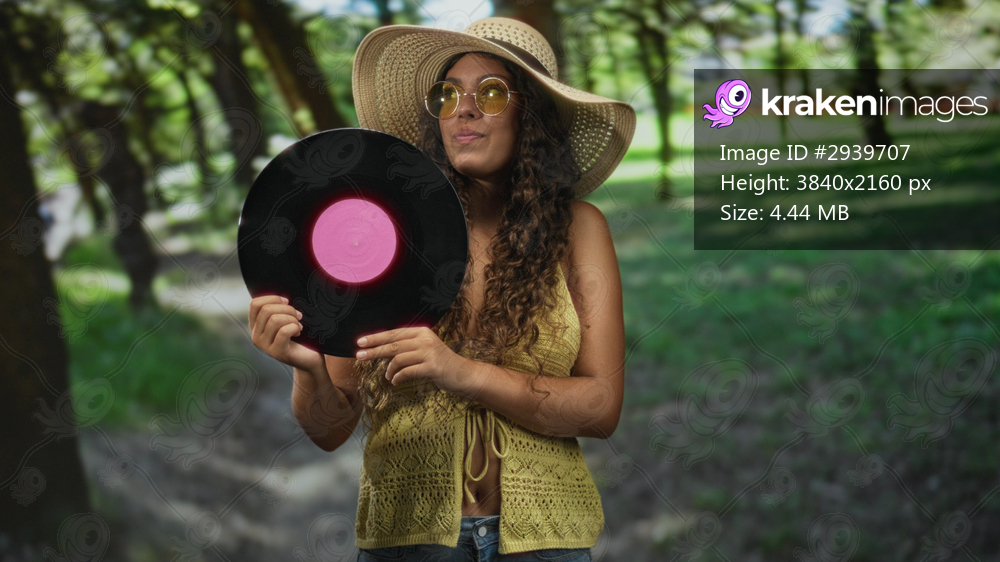Hispanic woman holding vinyl record with hands, smiling and wearing sunhat and yellow sunglasses in forest; summer nostalgia.