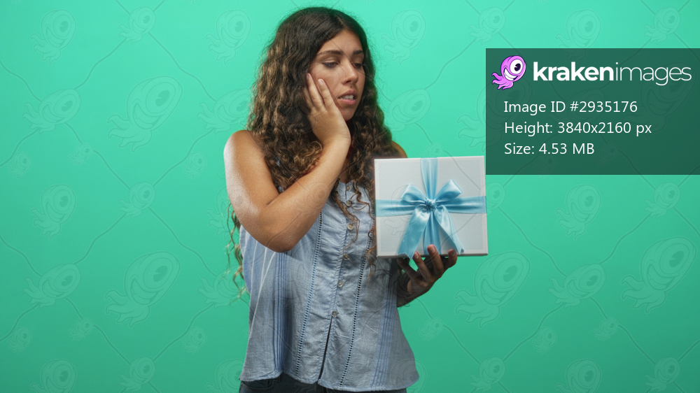Hispanic woman holding wrapped gift box with blue ribbon and touching cheek in studio; worry toothache.