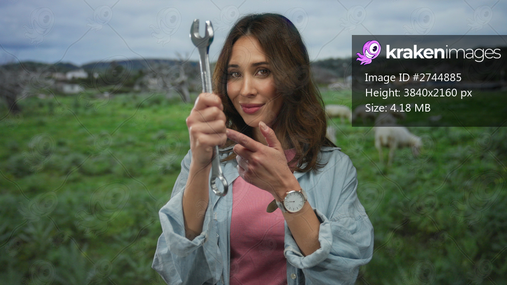Hispanic woman holding wrench outside, wearing a watch, with sheep grazing in a lush green field under a cloudy sky, highlighting rural tool usage.
