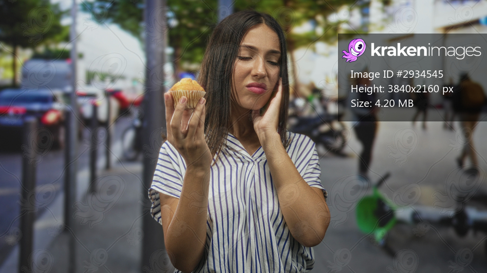 Hispanic woman holds a muffin and presses her cheek for toothache on a busy street; discomfort and hunger.
