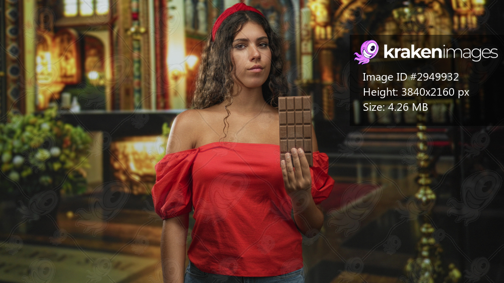 Hispanic woman holds chocolate bar with bare shoulder visible in ornate church building; temptation calm.