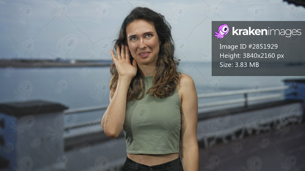 Hispanic woman holds hand to ear on a sunlit seaside promenade by the railing, listening for distant sounds; curiosity.
