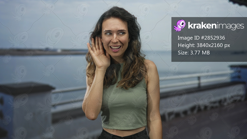Hispanic woman holds hand to ear on a sunlit seaside promenade by the railing, listening for distant sounds; curiosity.