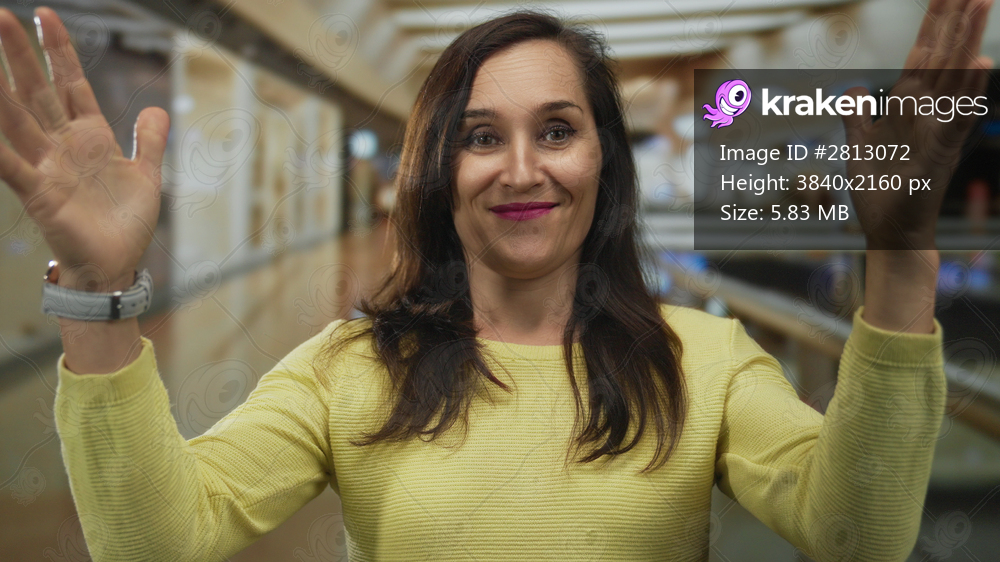 Hispanic woman holds hands apart to show large size gesture in brightly lit mall; scale display amazement.