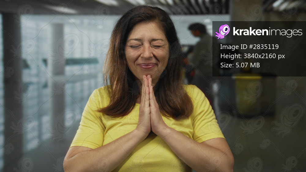 Hispanic woman holds hands pressed together in a prayer gesture at a busy airport terminal; gratitude.