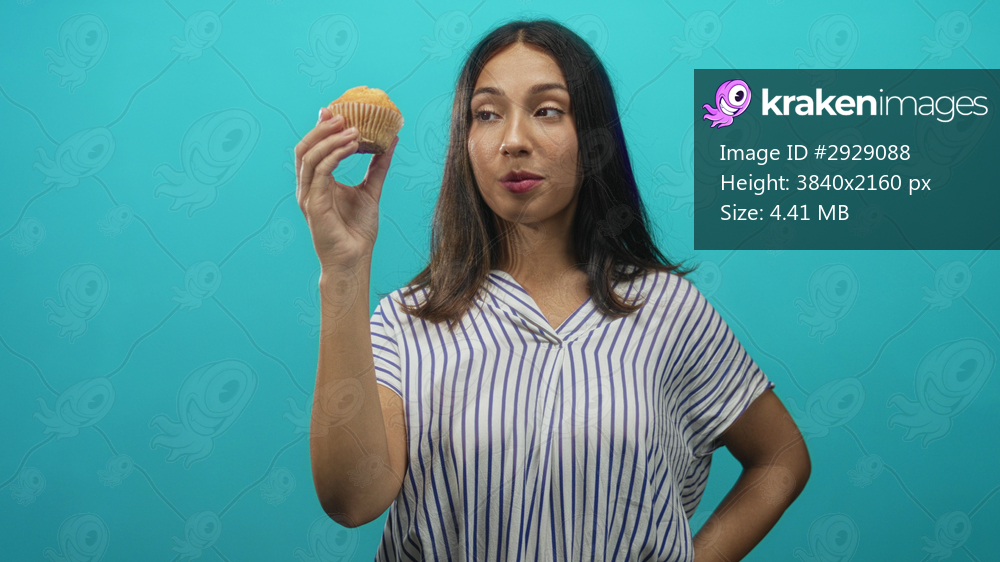 Hispanic woman holds muffin in hand in turquoise studio with striped shirt and closed eyes, posing with one arm akimbo; simple contentment.