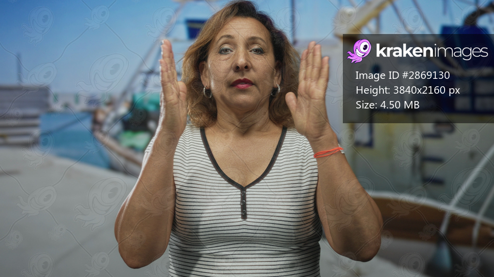 Hispanic woman holds palms together in front of chest at port beside boat in bright daylight; inner peace moment.