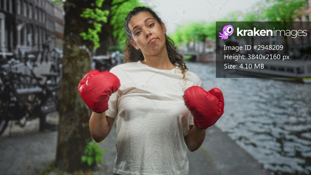Hispanic woman holds red boxing gloves up on street canal walkway with neutral expression; resilience confidence.