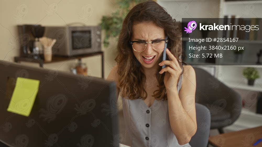 Hispanic woman holds smartphone to ear while viewing computer monitor at wooden desk in office; stress.