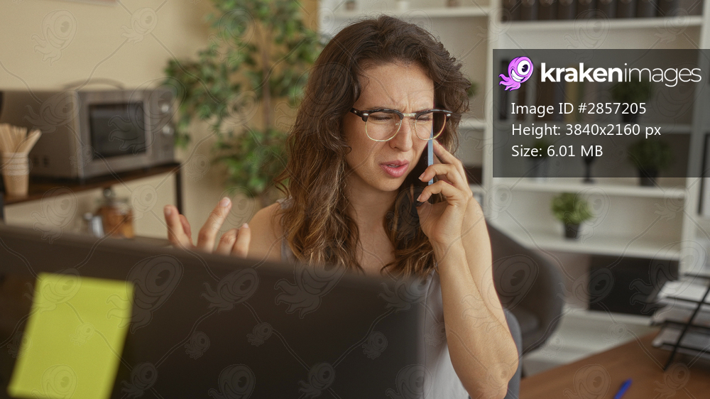 Hispanic woman holds smartphone to ear while viewing computer monitor at wooden desk in office; stress.