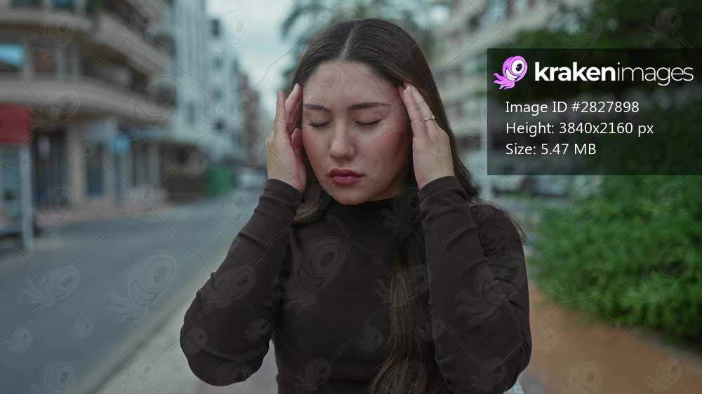 Hispanic woman holds temples on city street lined with apartments and parked cars while wearing long dark top; discomfort.