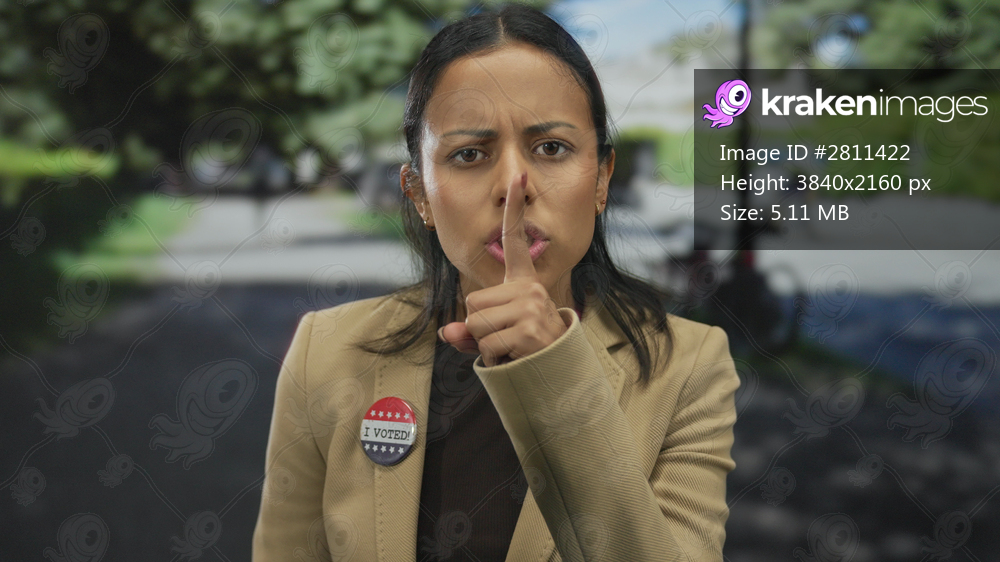 Hispanic woman with i voted badge holds finger to lips in a green park outdoor setting symbolizing a quiet moment of reflection and civic responsibility in the united states. - Kraken Images