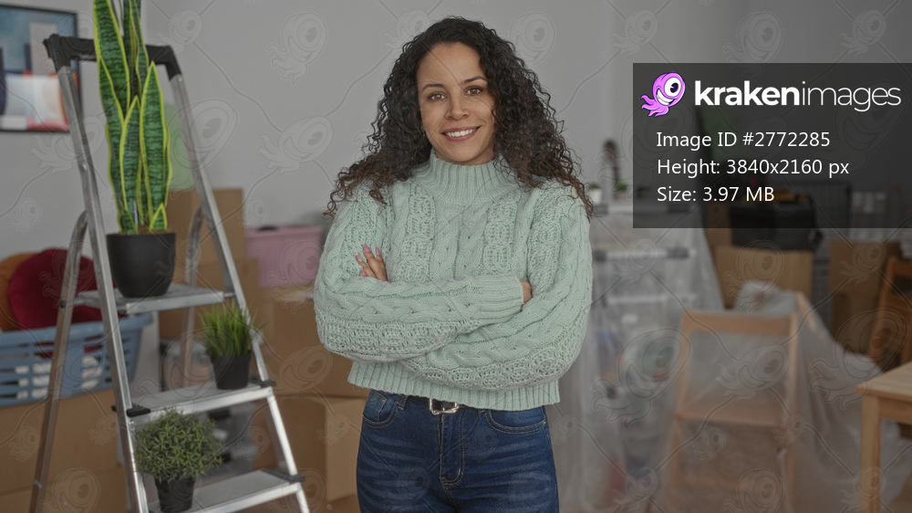 Hispanic woman in a cozy sweater stands confidently in a newly furnished living room with moving boxes and a ladder adorned with potted plants, signifying a new home setup. - Kraken Images