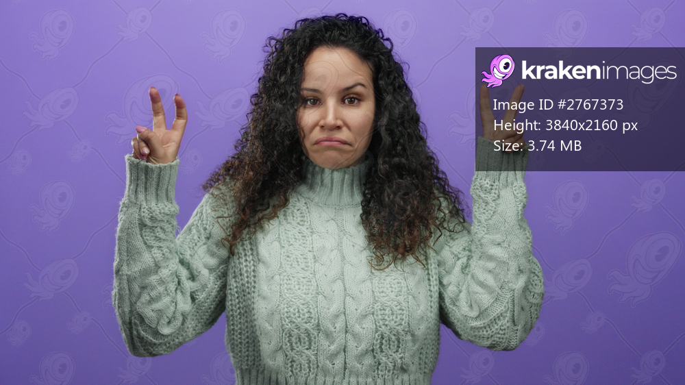 Hispanic woman in a green sweater making quotation marks with her fingers, standing against a purple background, expressing uncertainty or sarcasm.