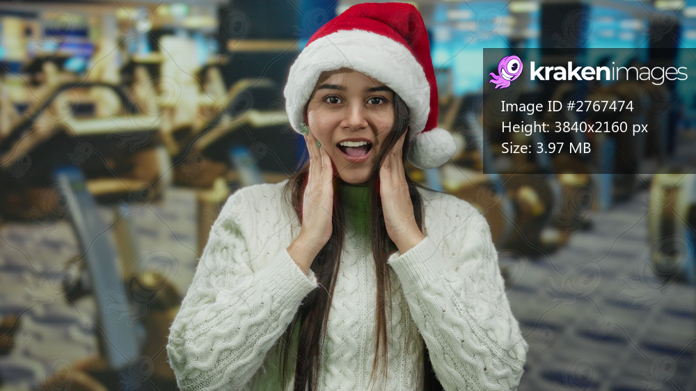 Hispanic woman in a gym wearing a santa hat and sweater expresses surprise with hands on cheeks, surrounded by exercise machines.