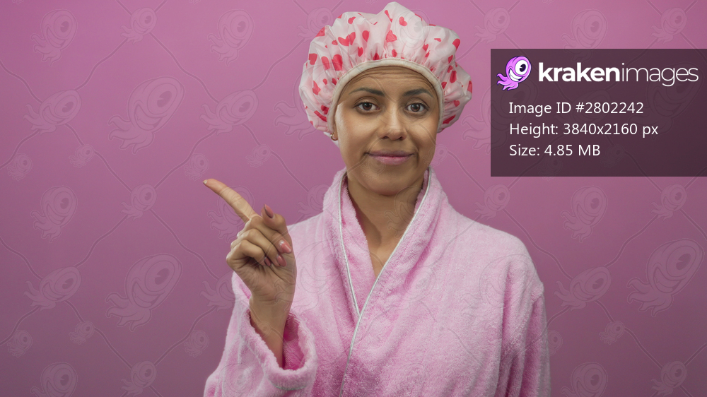 Hispanic woman in a pink bathrobe with a heart-patterned shower cap poses against an isolated pink background, pointing and gesturing expressively with her finger. - Kraken Images