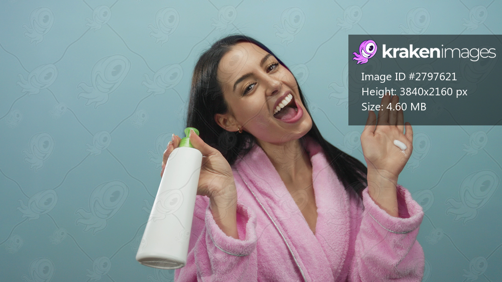 Hispanic woman in a pink bathrobe enthusiastically holds skincare lotion against a blue background suggesting beauty routine.