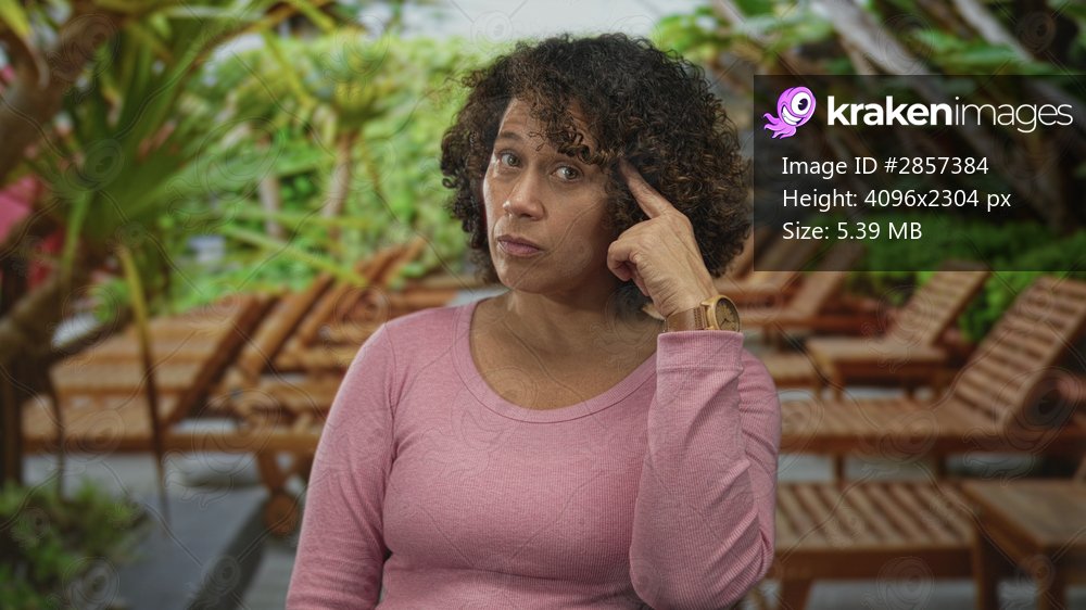 Hispanic woman in a pink top points finger to temple in building with thoughtful gaze; contemplation insight.