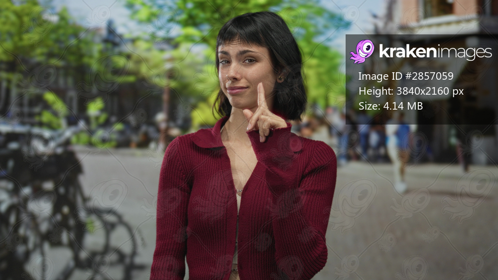 Hispanic woman in a red cardigan pointing finger to herself on a busy city street with parked bicycles; rejection.